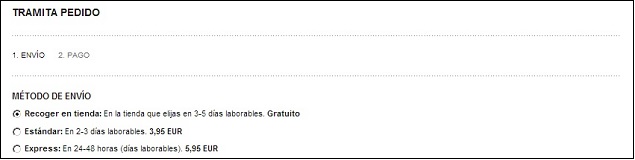 Las opciones de envío que Zara.com le da al cliente son varias. Por un lado, el artículo se puede recoger en la tienda que el cliente elija, entre los 3 y 5 días posteriores al pedido. Esta opción es gratuita para el cliente, que puede escoger también un envío estándar a domicilio (de 2 a 3 días laborables), con un recargo de 3,95 euros, o un envío express (de 24 horas a 48 horas) por 5,95 euros. El cliente se decanta por el envío estándar.