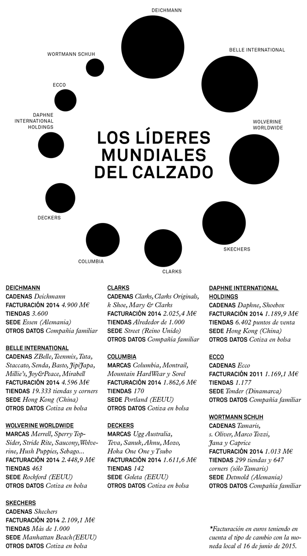 En 2014, hubo tres grupos que por primera vez superaron la barrera de los 2.000 millones de euros en ventas. Fueron los estadounidenses Wolverine Worldwide (propietario de Merrell, entre otras) y Skechers, y la británica Clarks, que en esta ocasión, baja un peldaño y se sitúa en la quinta posición del ránking, avanzada por Skechers. Estados Unidos también es el origen de otros dos gigantes del calzado, Columbia, muy especializado en outdoor, y Deckers, cuya marca estrella es Ugg.