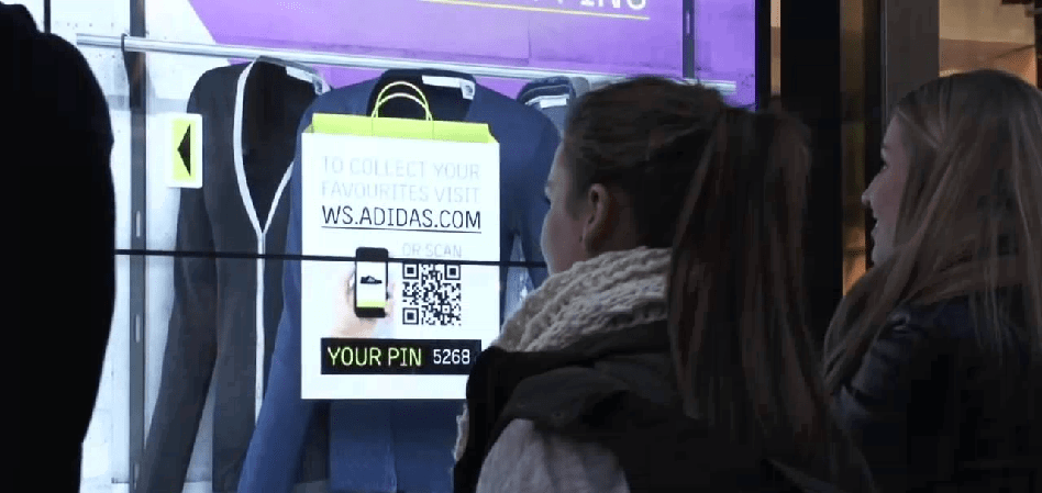 Adidas también probó el concepto en 2013 con su cadena Neo. A través del escaparate, los transeúntes podían ver la oferta de la compañía en todas sus versiones, arrastrar los productos que más le interesaran a una cesta de la compra y finalizar la operación desde su móvil sin necesidad de entrar en la tienda.