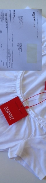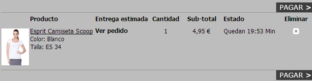 Finalmente encuentra una de la marca Esprit, que sólo está disponible en blanco y en talla 34, y tiene un valor de 4,95 euros (anteriormente costaba 15,95 euros, según la web). El sitio exhibe fotos de la camiseta desde distintos ángulos e incluye una breve descripción del producto. El cliente añade el producto a su cesta y hace click en el botón de pago.