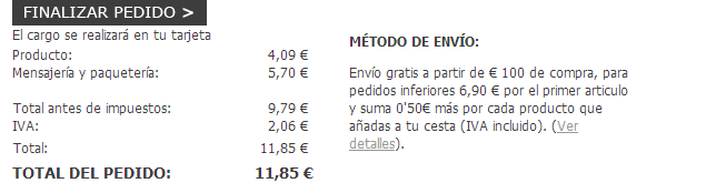 El método de pago pasa por tarjeta de crédito o débito: Visa, MasterCard o American Express. El envío es gratuito a partir de los 100 euros de compra; al ser un pedido de valor inferior, el coste de mensajería y paquetería es de 5,70 euros. El precio del producto (contando el envío) sube a 11,85 euros (IVA incluido).