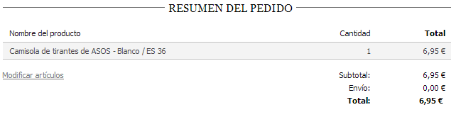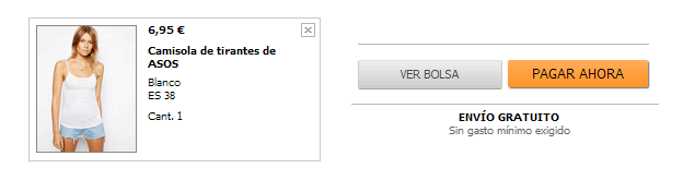 El cliente ingresa a la categoría Mujer buscando una camiseta blanca, la más económica. Ingresa a la categoría Tops y se decide por una camiseta básica de Asos Collection, que está disponible en color blanco y en todas las tallas (el cliente elige la talla mediana) por un valor de 6,95 euros. El sitio exhibe fotos de la camiseta desde distintos ángulos e incluye una breve descripción del producto, además de recomendaciones de productos similares. El cliente añade el producto a su cesta y hace click en el botón de pago.