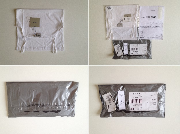 El packaging consta de una bolsa gris estampada con el logo de Asos y un albarán de entrega. Dentro está la camiseta, protegida dentro de una bolsa de plástico transparente y acompañada de la factura de la compra.