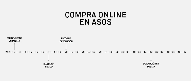 La web de Asos ya informa, en el mismo proceso de compra, de la política del grupo en cuanto a devoluciones. Los productos pueden ser devueltos en un plazo de 28 días después de la fecha de recepción, retornando el importe pagado. Si el cliente desea una talla o color distinto, así como adquirir productos alternativos, deberá realizar un nuevo pedido (no se permite el cambio).