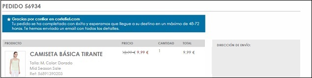 A la mañana siguiente, y antes de la recepción, el comprador manda un correo al servicio de atención al cliente para preguntar el día de entrega del pedido. Automáticamente, el grupo Cortefiel manda una respuesta prediseñada donde le informa de que el correo será procesado y contestado en un máximo de 48 horas. A los dos días laborables de haber efectuado el pedido, el cliente recibe la camiseta, mediante un mensajero de Seur. El mismo día, el comprador también recibe el correo en respuesta a su consulta, donde el grupo le informa de que el paquete “ya ha sido entregado en la dirección indicada”.