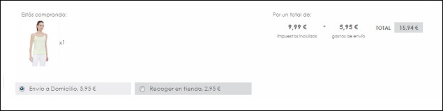 El cliente tiene dos opciones de envío: la primera, a recoger en tienda, con un precio de 2,95 euros, y la segunda, a domicilio, por 5,95 euros. Escoge la opción de envío a domicilio, por la que Cortefiel informa que tarda de 2 a 3 días laborables en hacer la entrega del pedido. Seguidamente, un panel en la parte inferior de la pantalla le pregunta si tiene dudas y, a continuación, aparece el precio final: 15,94 euros.