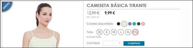 Utilizando nuevamente los filtros, en la sección de mujer de Cortefiel encuentra una camiseta de tirantes básica, disponible en seis colores. Escoge el tono amarillo, que es el más parecido al que el cliente busca, con un precio de 9,99 euros. Una vez seleccionado el artículo, el consumidor tiene la posibilidad de volver a escoger la talla y el color.
