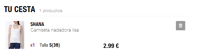 El cliente regresa al escaparate a buscar otro producto y añade a la cesta una camiseta de la marca Only por un valor de 19,95 euros, suficiente para alcanzar los 22 euros requeridos (suma un total de 22,94 euros).