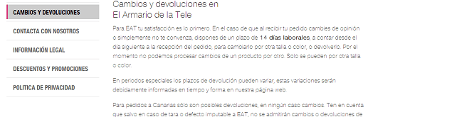 Para devolverlo, el cliente busca en la home la pestaña de Cambios y devoluciones, que está visible en la parte inferior del sitio. Allí EAT explica que el cliente dispone de un plazo de 14 días laborales, a contar desde el día siguiente a la recepción del pedido, para cambiarlo por otra talla o color, o devolverlo. Además, aseguran que por el momento no pueden procesar cambios de un producto por otro y que los productos deben estar en perfecto estado, en su embalaje original y en la caja o sobre en la que llegó el pedido.