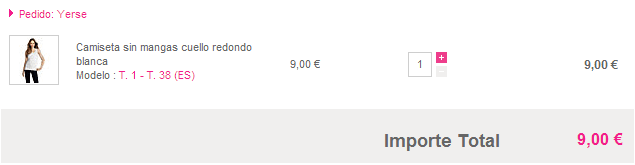 La camiseta blanca básica más económica que encuentra el cliente es de tirantes y aparece en la campaña de la enseña Yerse, con un valor de 9 euros. Al seleccionar el producto, se despliega información sobre su composición y el lavado recomendado y tres fotos de la camiseta desde distintos ángulos. Especifica el precio de venta en tienda (27 euros), los gastos de envío fijos (6,5 euros) y hay disponible un filtro en el que el cliente puede elegir en función del color, la talla y el precio. En el momento de la compra, figuran tres tallas disponibles (38, 44 y 46) y permite adquirir hasta doce ítems.