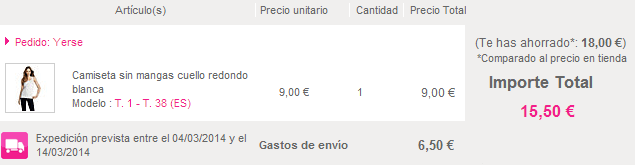 El método de pago pasa por varias opciones: Visa, Visa Electron, MasterCard, American Express y PayPal. El precio del producto (contando el envío a domicilio) sube a 15,50 euros (IVA incluido) y en el resumen de compra aparece el número de euros que el cliente se ha ahorrado comprando en el sitio respecto al precio original de la prenda.