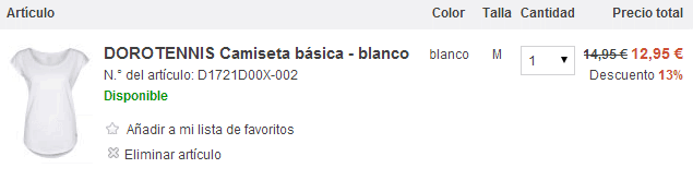 Finalmente el cliente se decide por una camiseta básica de la marca Dorotennis que está disponible en color blanco y en todas las tallas (el cliente elige la talla mediana) por un valor de 12,95 euros (el cliente no encuentra ninguna más económica). Al momento de elegir un producto, Zalando ofrece una tabla de tallas para aquel cliente que no sabe qué talla necesita, y brinda la opción de solicitar la talla deseada en caso de que, al momento de la compra, esta no esté disponible.