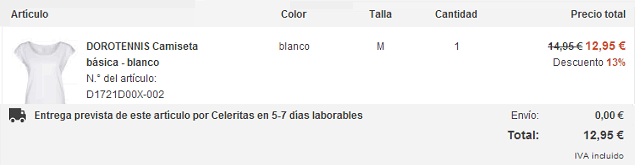 El cliente recibe su camiseta el 25 de febrero por la mañana (antes del plazo de 5 a 7 días laborables que establece el sitio web), tras haberla comprado el 21 de febrero. Un mensajero de la empresa Envialia trae el producto hasta la dirección de entrega.