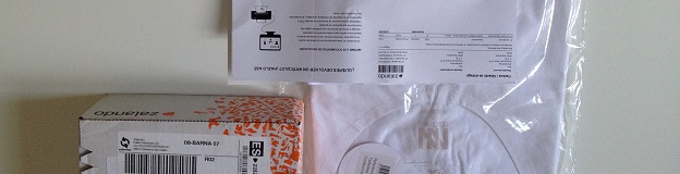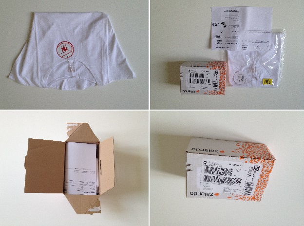 El packaging consta de una pequeña caja blanca con el logo de Zalando y algunos detalles dibujados en color naranja. Dentro está la camiseta, protegida dentro de una bolsa de plástico transparente y acompañada de la factura de la compra y una serie de instrucciones en caso de querer solicitar la devolución.